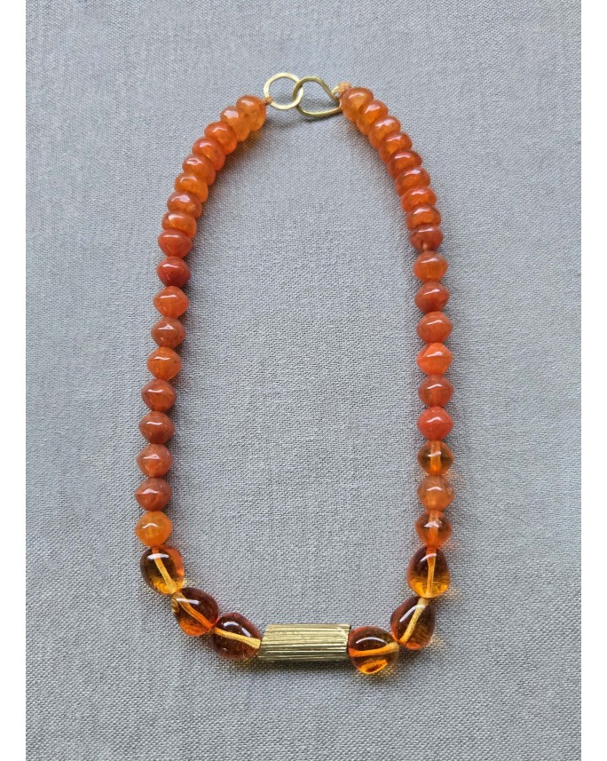 Collar elaborado con cuentas de vidrio, terminaciones y dije realizados en bronce (48cm de largo)