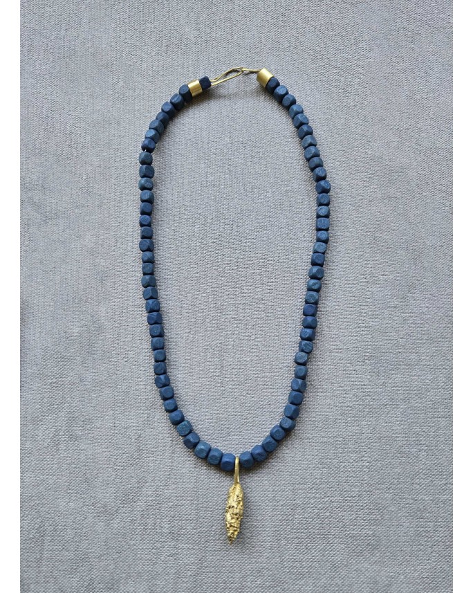 Collar elaborado con cuentas de madera y dije de bronce